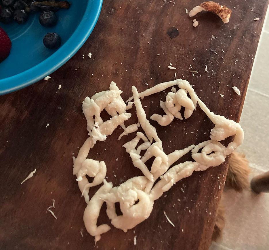 and then making finger drawings on the floor and on the windows—even rolling pieces of pancake into pieces to make his own pancake UPS sculpture at breakfast!
